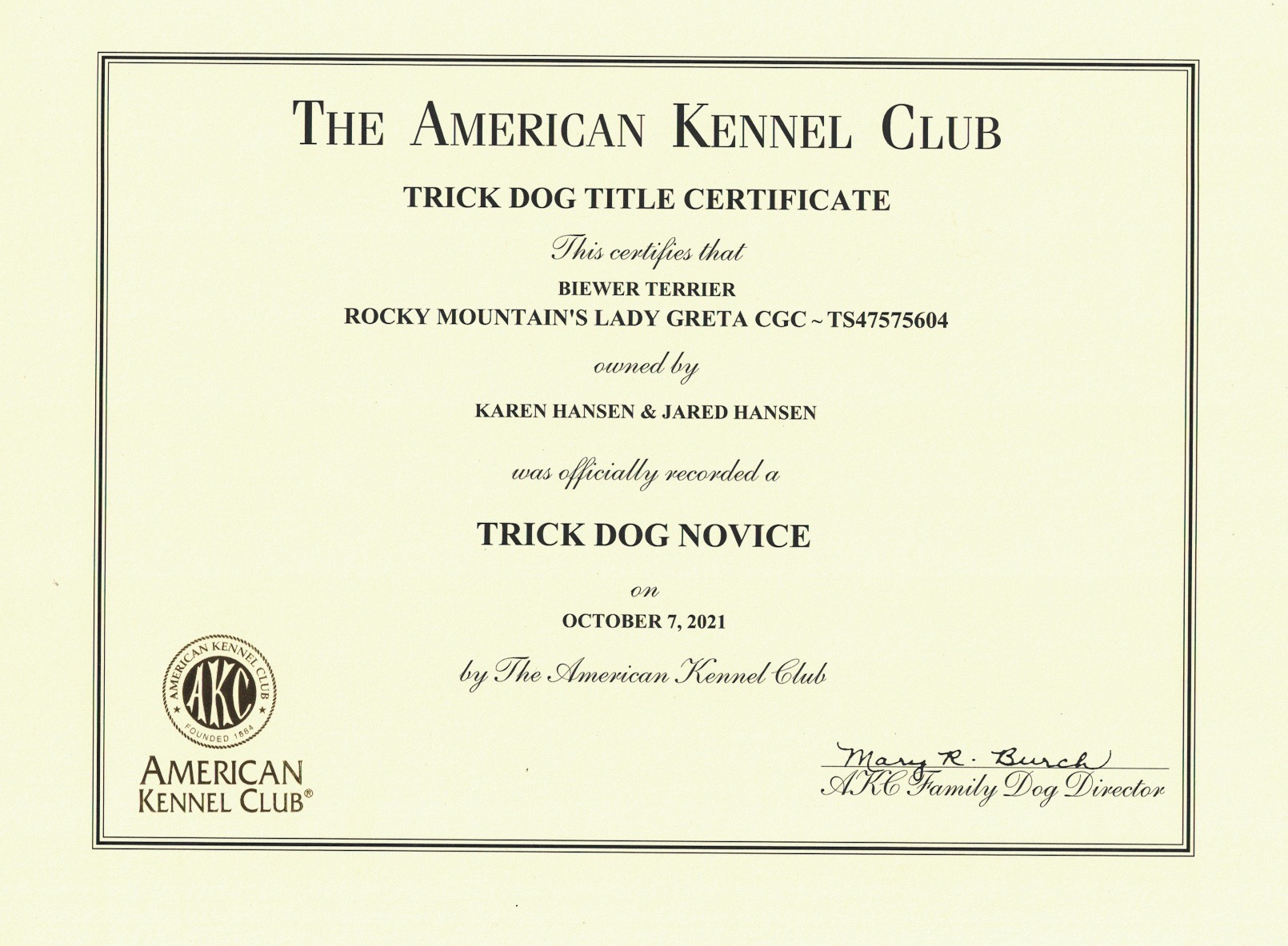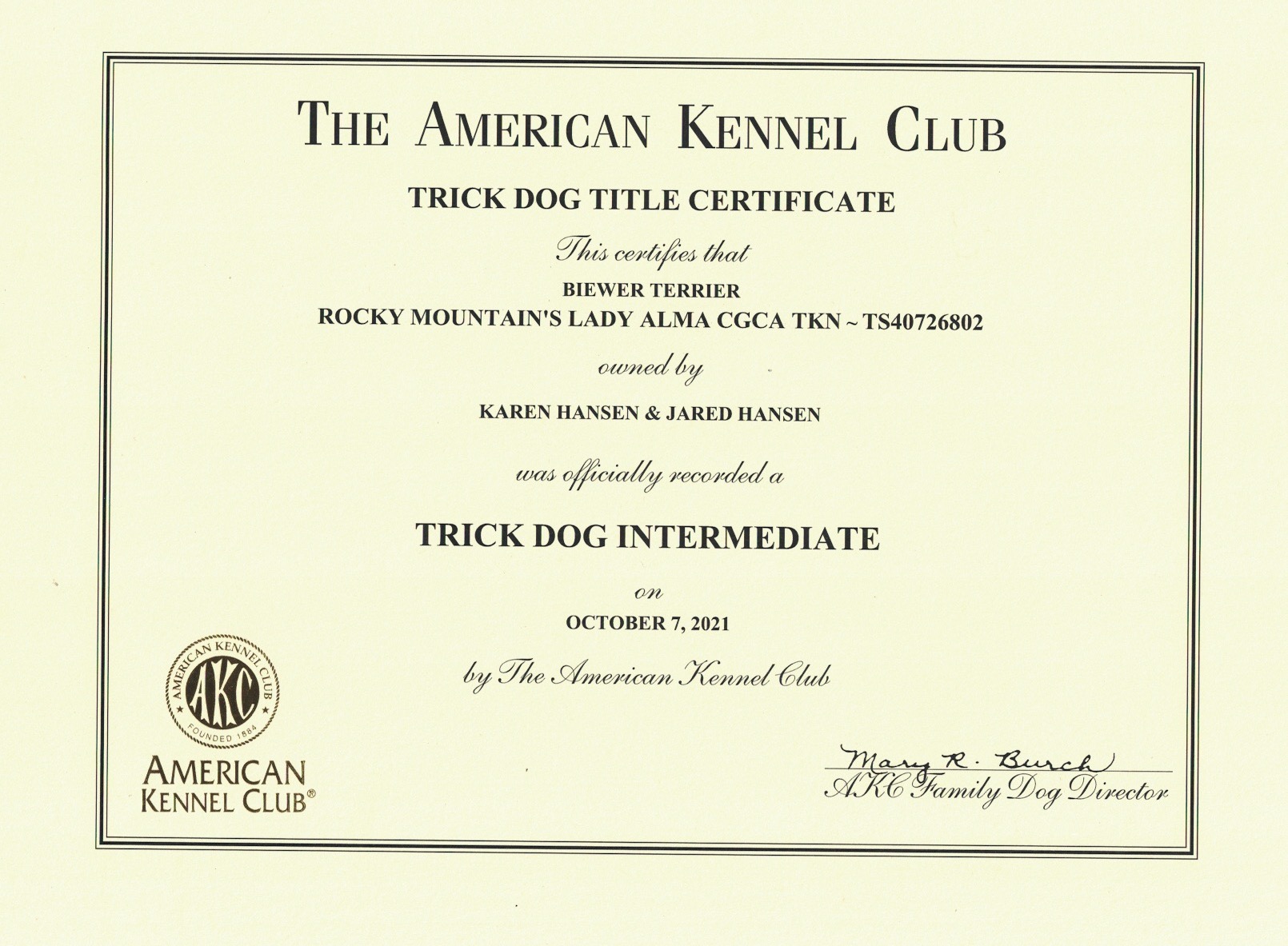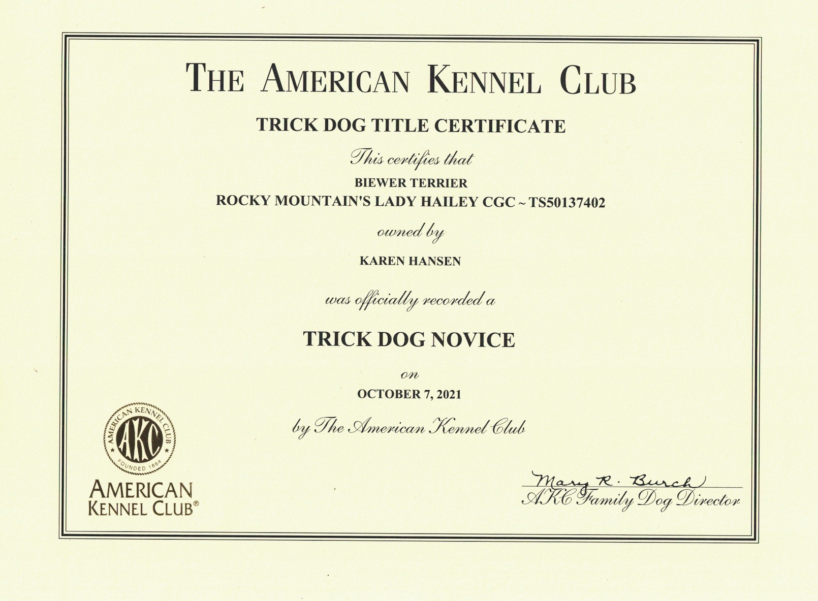 AKC Trick Dog & CGC Certificates Rocky Mountain's Lady Alma CGC CertificateRocky Mountain's Sir Andy CGC CertificateRocky Mountain's Sir Anthony CGC CertificateRocky Mountain's Lady Ava CGC CertificateRocky Mountain's Lady Daisy CGC CertificateRocky Mountain's Lady Gina CGC CertificateRocky Mountain's Lady Greta CGC CertificateRocky Mountain's Lady Hailey CGC CertificateRocky Mountain's Lady Heidi CGC CertificateRocky Mountain's Lady Jolene CGC CertificateRocky Mountain's Lady Jolly CGC CertificateRocky Mountain's Lady Kendra CGC CertificateRocky Mountain's Lady Leila CGC CertificateRocky Mountain's Sir Remi Jr. CGC CertificateRocky Mountain's Lady Talia CGC CertificateRocky Mountain's Lady Tinka CGC CertificateRocky Mountain's Sir Zachery CGC CertificateRocky Mountain's Sir Zander CGCU CertificateRocky Mountain's Lady Alma Trick Dog IntermediateRocky Mountain's Sir Andy Trick Dog NoviceRocky Mountain's Sir Anthony Trick Dog NoviceRocky Mountain's Lady Ava Trick Dog NoviceRocky Mountain's Lady Daisy Trick Dog NoviceRocky Mountain's Lady Greta Trick Dog NoviceRocky Mountain's Lady Hailey Trick Dog NoviceRocky Mountain's Lady Heidi Trick Dog Novice 1 2 3 4 5 Rate this envira Karen Hansen @Rocky Mountain Biewer Terriers You can text me at (970)882-3299.