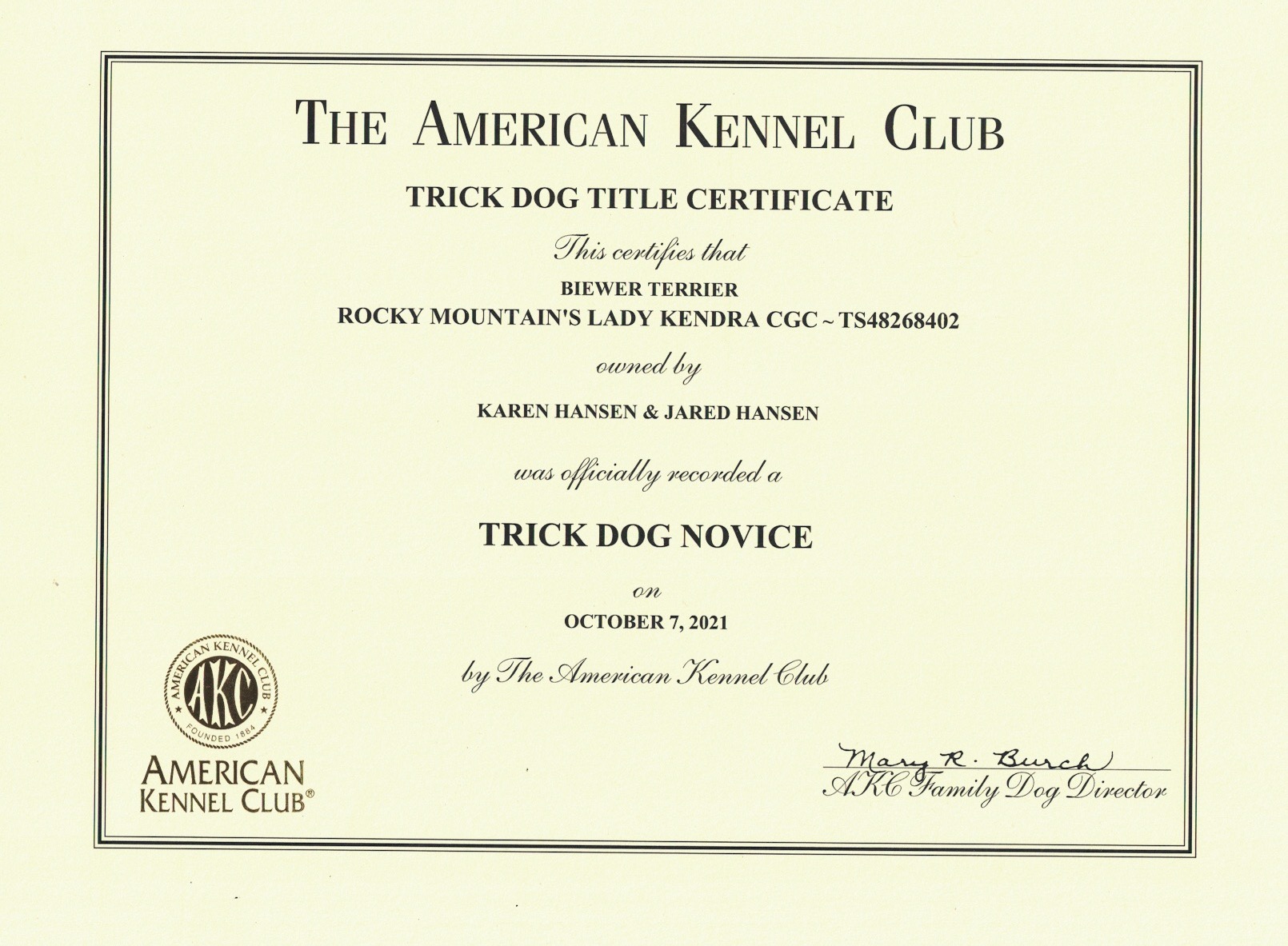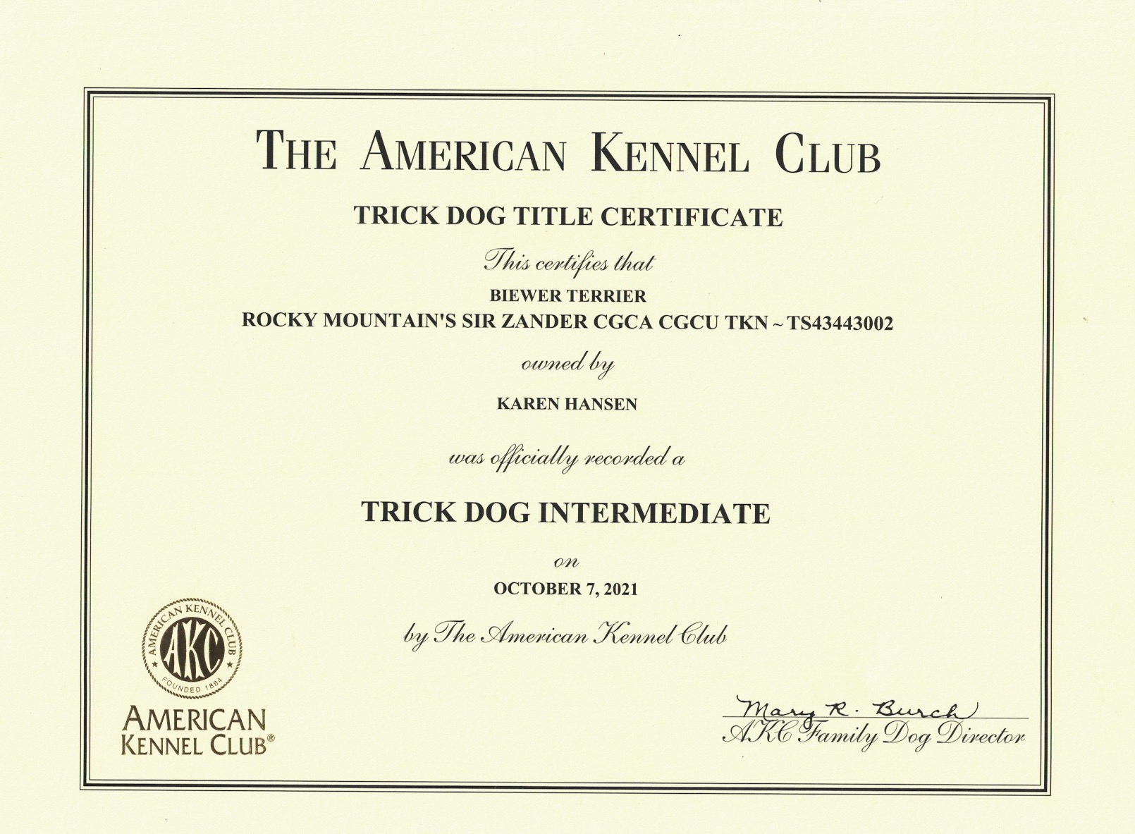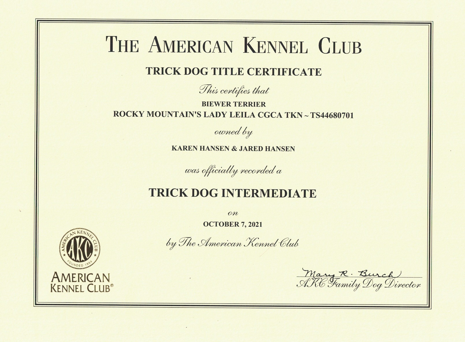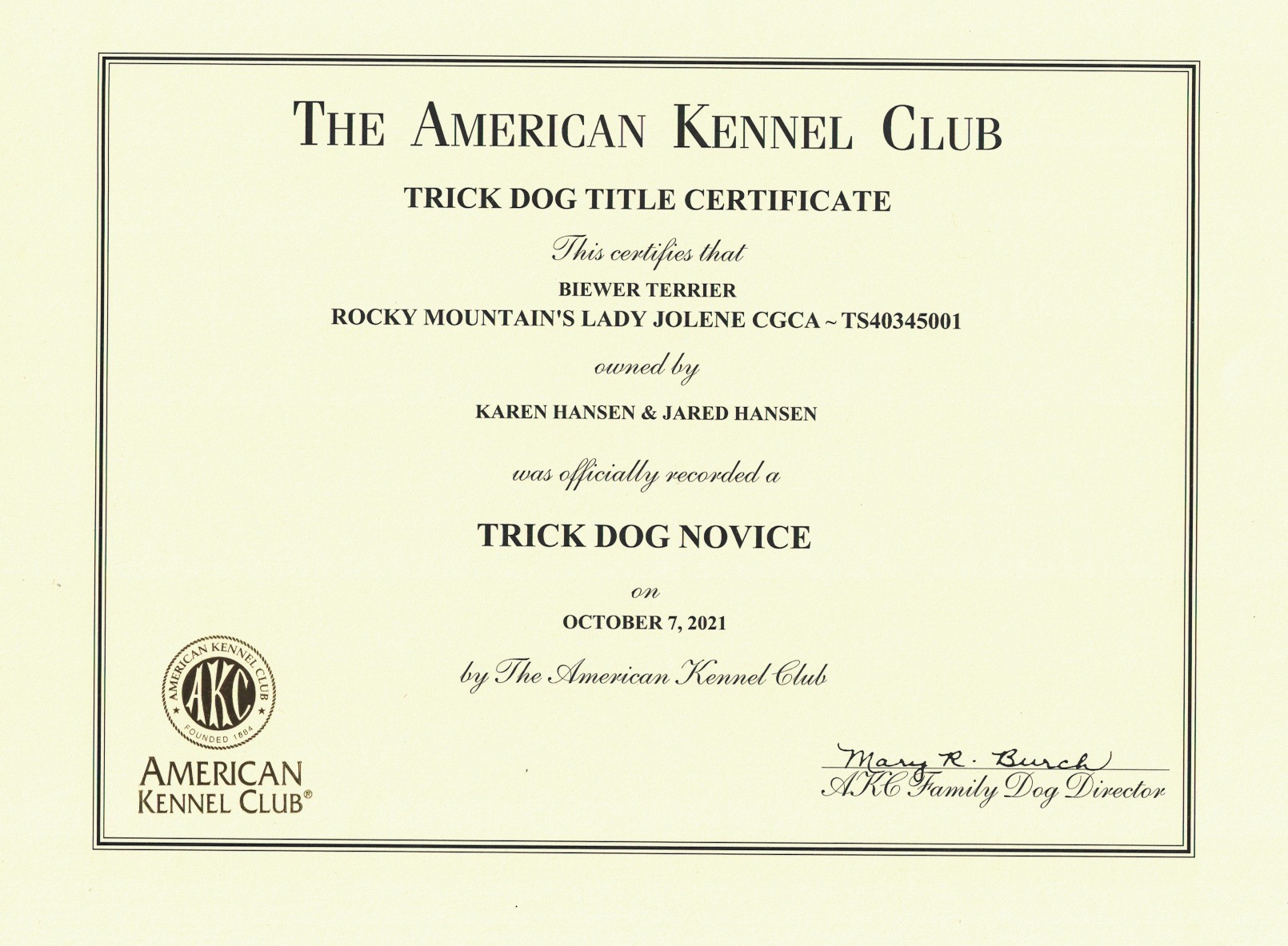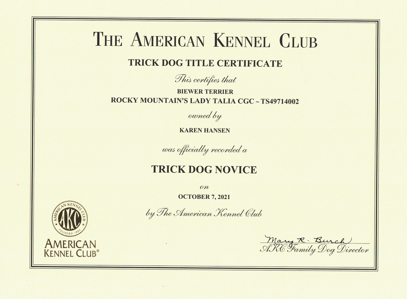 AKC Trick Dog & CGC Certificates Rocky Mountain's Lady Jolene Trick Dog NoviceRocky Mountain's Lady Jolly Trick Dog NoviceRocky Mountain's Lady Kendra Trick Dog NoviceRocky Mountain's Lady Leyla Trick Dog IntermediateRocky Mountain's Sir Remi Jr. Trick Dog IntermediateRocky Mountain's Lady Talia Trick CGC CertificateRocky Mountain's Lady Tinka Trick Dog Intermediate CertificateRocky Mountain's Sir Zachery Trick Dog Novice CertificateRocky Mountain's Sir Zander Trick Dog Intermediate Certificate 1 … 3 4 5 Rate this envira Karen Hansen @Rocky Mountain Biewer Terriers You can text me at (970)882-3299.