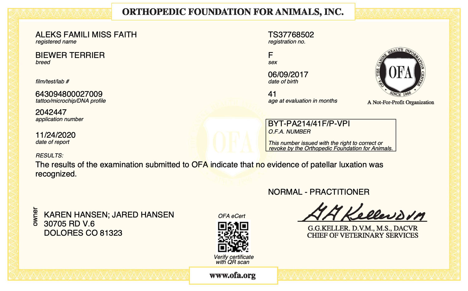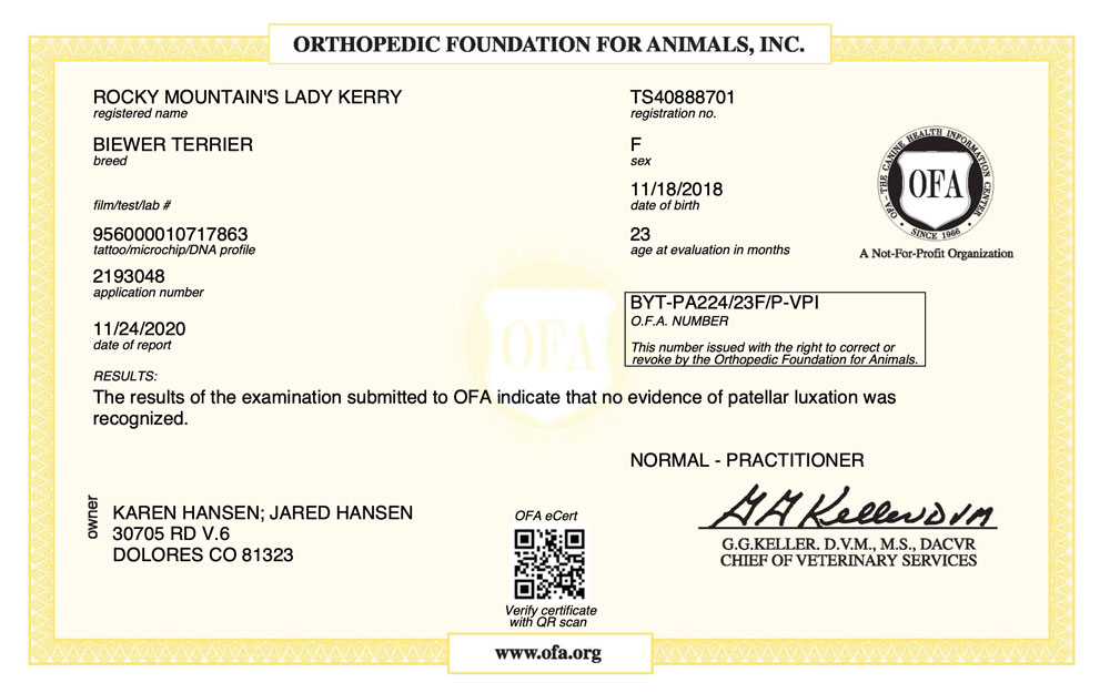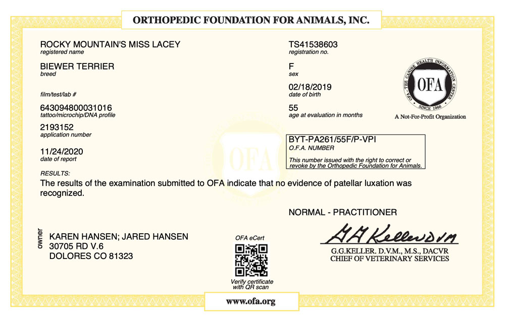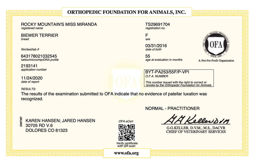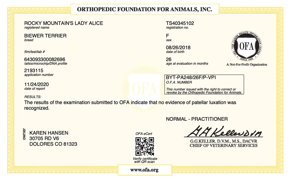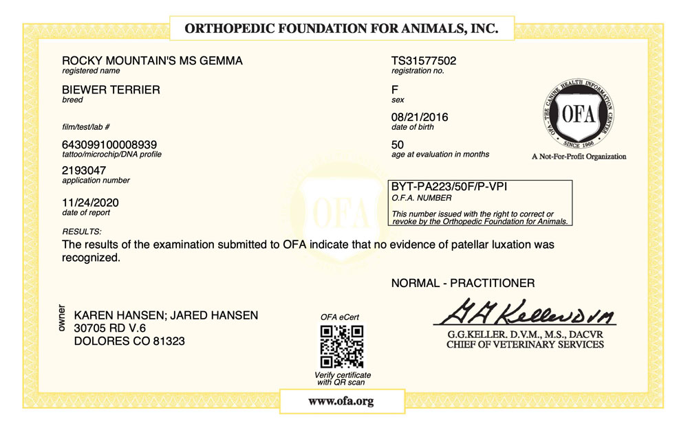 1. Luxating Patella Test OFA Certificates Rocky Mountain's Lady Aurora OFA Patellar Luxation Test Certificate Rocky Mountain's Lady Alice OFA Patellar Luxation Test Certificate Rocky Mountain's Sir Mishla OFA Patellar Luxation Test Certificate RetiredRetiredRetiredRetiredRetiredRetiredRetiredRetiredRetiredRetiredRetiredRetiredRetiredRetired 1 2 Rate this envira Karen Hansen @Rocky Mountain Biewer Terriers You can text me at (970)882-3299.