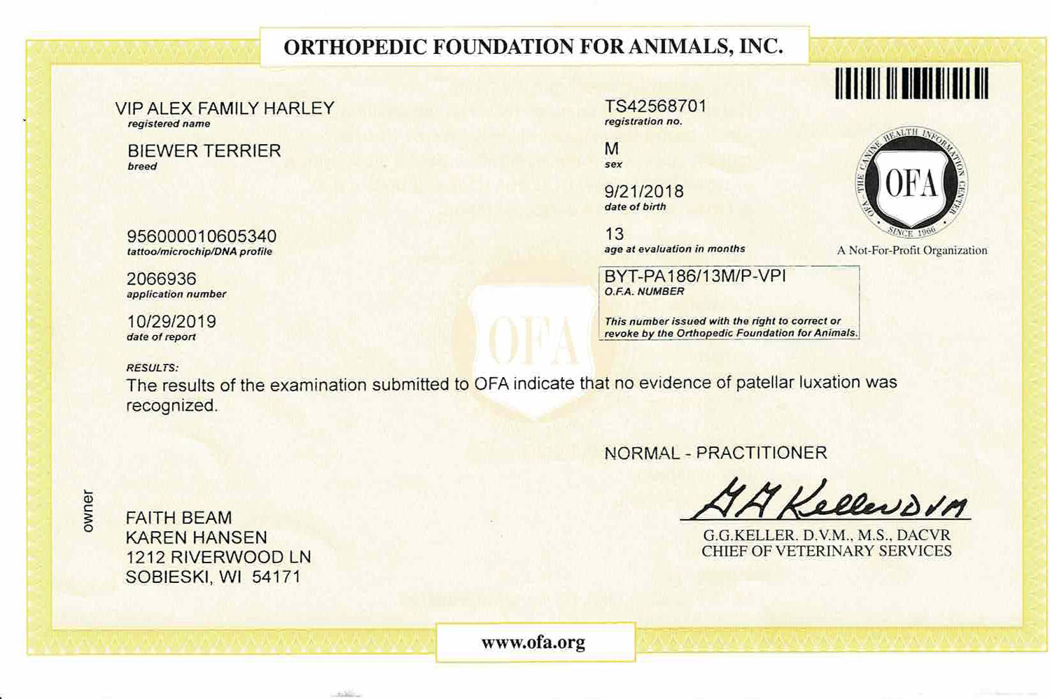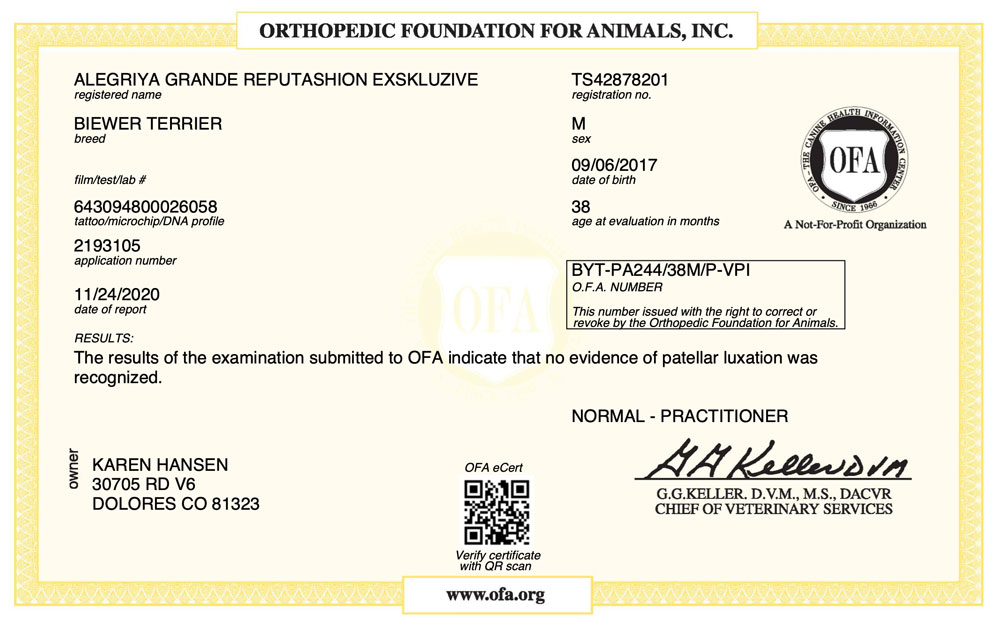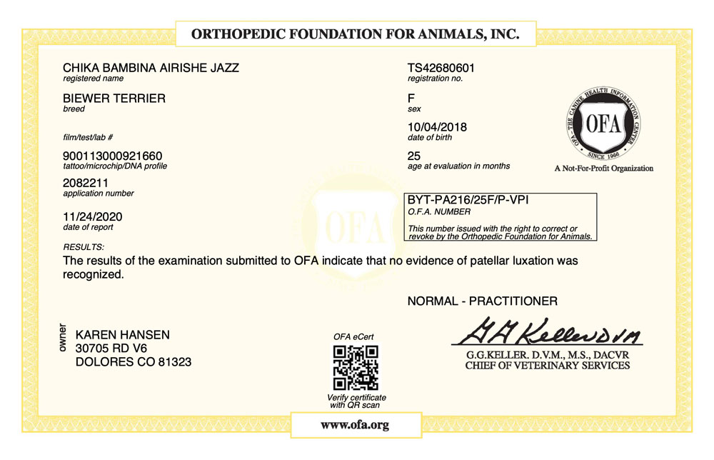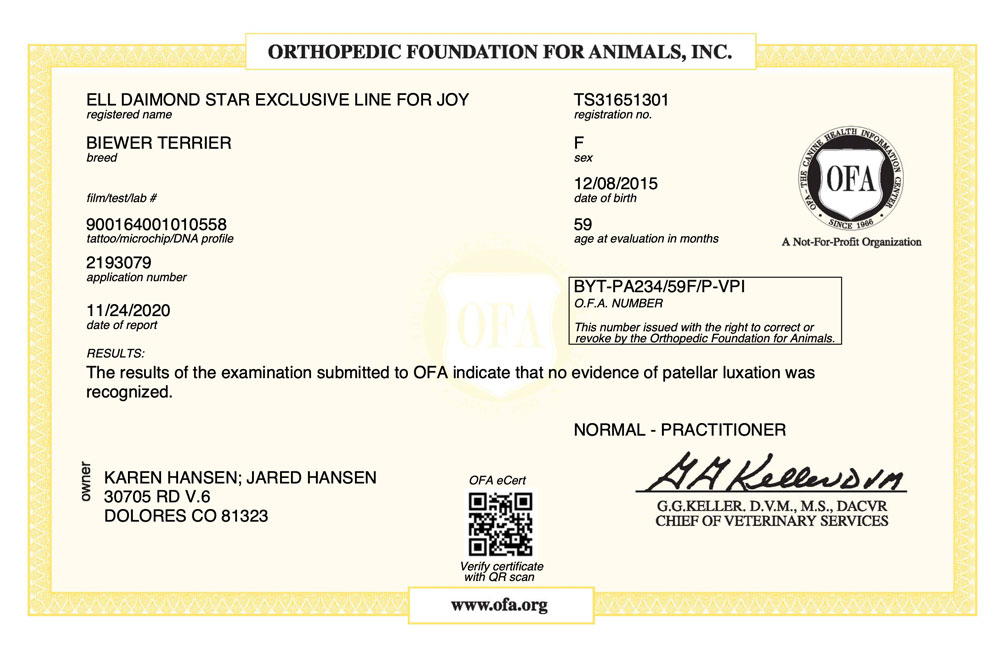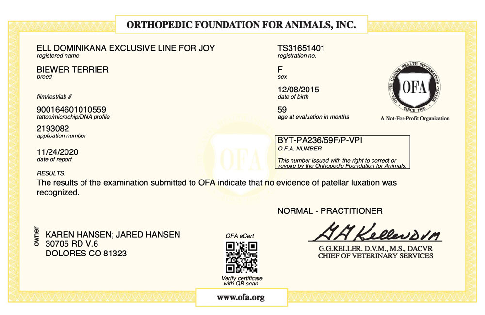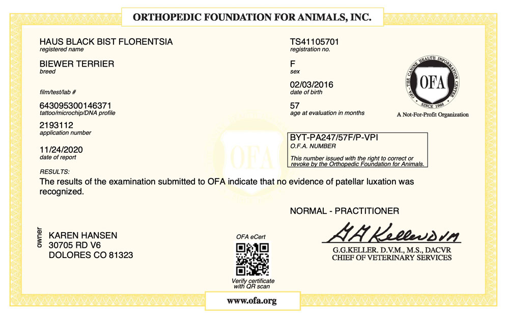 1. Luxating Patella Test OFA Certificates Rocky Mountain's Lady Aurora OFA Patellar Luxation Test Certificate Rocky Mountain's Lady Alice OFA Patellar Luxation Test Certificate Rocky Mountain's Sir Mishla OFA Patellar Luxation Test Certificate RetiredRetiredRetiredRetiredRetiredRetiredRetiredRetiredRetiredRetiredRetiredRetiredRetiredRetired 1 2 Rate this envira Karen Hansen @Rocky Mountain Biewer Terriers You can text me at (970)882-3299.